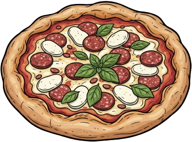 Pomodoro, mozzarella, prosciutto cotto Sabbione, funghi champignon freschi, carciofini, olive nere, wurstel, salamino piccante